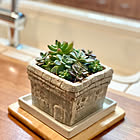 k...さんは、ダイソーの工作材料と黒板を鉢カバーにリメイクしています。前面は塗装した工作材料をグルーガンで貼り合わせて作り、サイドには黒板を使っています。組木模様を楽しめる、存在感のある鉢カバーが完成していますね。