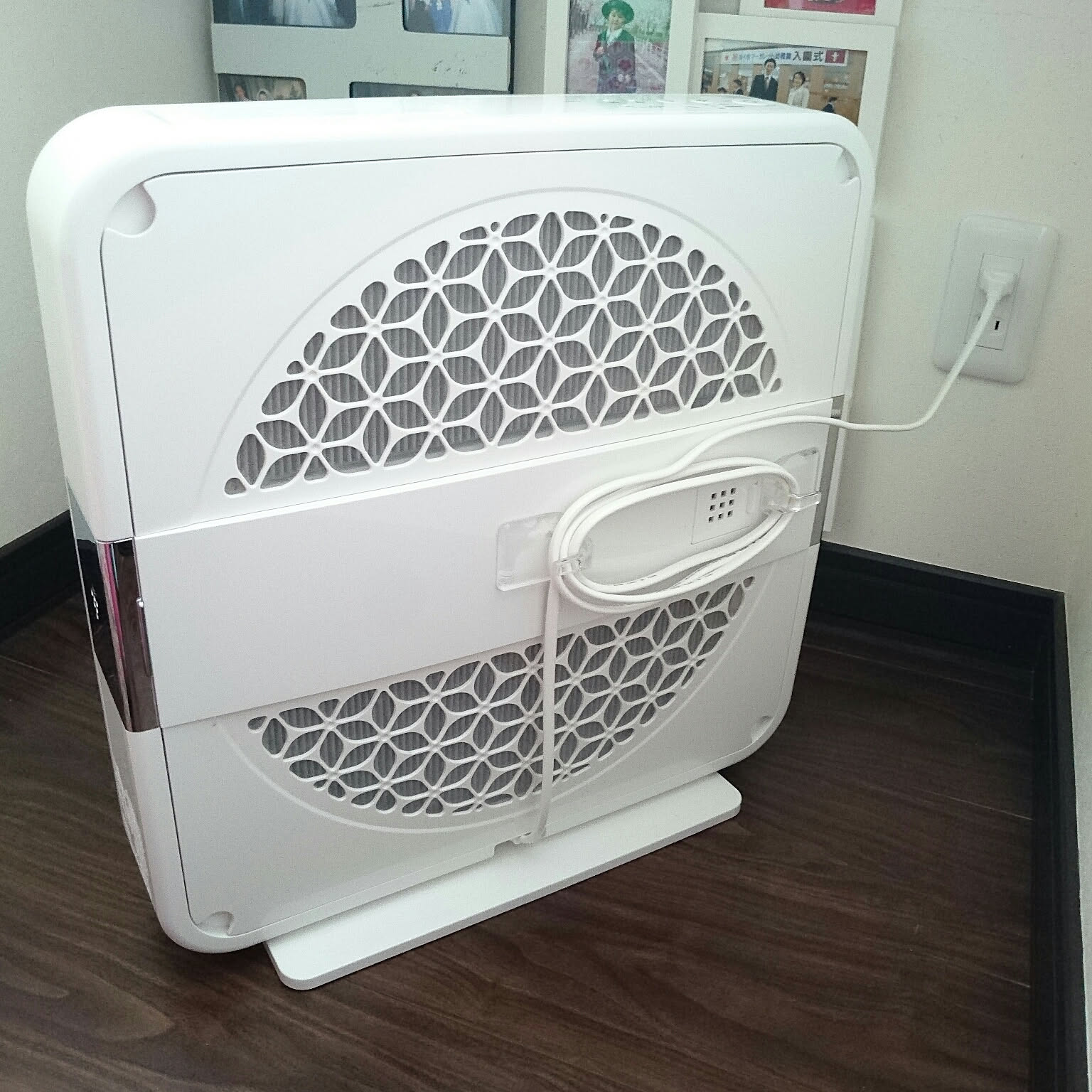 本体に取り付けた二つのフックで、空気清浄機のコードをまとめている実例です。この方法であれば、設置する場所によってコードの長さも簡単に変えることができ、とても便利!掃除をするときにコードが邪魔になることもありませんね。他の家電でも取り入れてみたくなる工夫です。