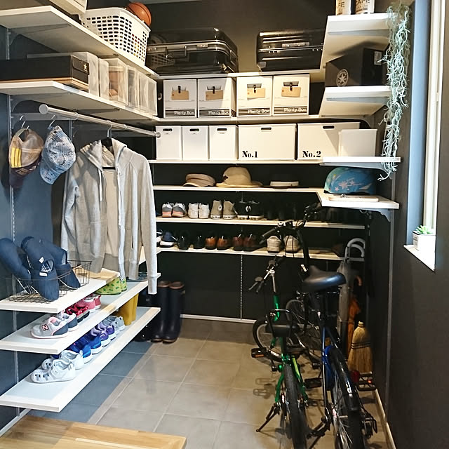 室内の自転車置き場は、サッと出し入れできる玄関が人気です。t.t.t.kaoさんのように広々としたシューズクロークがあるご家庭なら、お子さん用の自転車だけでなく大人の自転車も置けちゃいます。棚があるので、ヘルメットなども近くにまとめておけますよ。