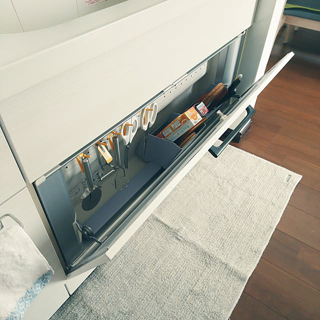 こちらは、tata-kukuさんのキッチンにあるシンク下ドアポケットです。メーカーは、LIXILの「アレスタ」だそう。キッチンバサミ、ピーラー、マッシャーなどを引っ掛けて収納されています。よく使うモノを収納しておけば、生活感が隠せていいですね。