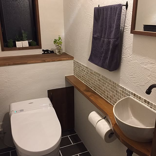 natsumama6566さんは、お手洗いの広い範囲で珪藻土の塗り壁を取り入れています。アンティークを思わせる黒いアイアンの水洗や、タオルバー、アクセントタイルなどと、珪藻土の雰囲気がベストマッチしていますね。ナチュラルな素材感で、落ち着けそうなお手洗いです。