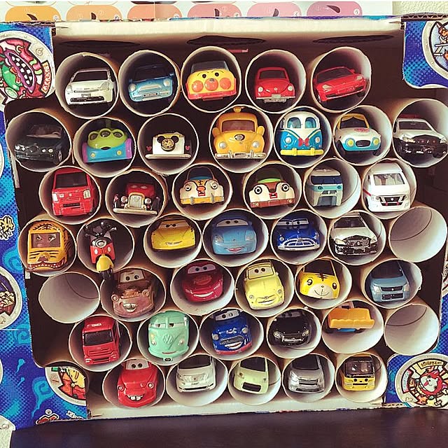 maiさんは、ダンボールの枠の中にトイレットペーパーの芯をたくさん並べて、おもちゃ収納にアレンジされました。車のおもちゃがピッタリ入るサイズ感が、気持ちがいいですね。元の形をいかした、楽しいアイデアに拍手です。