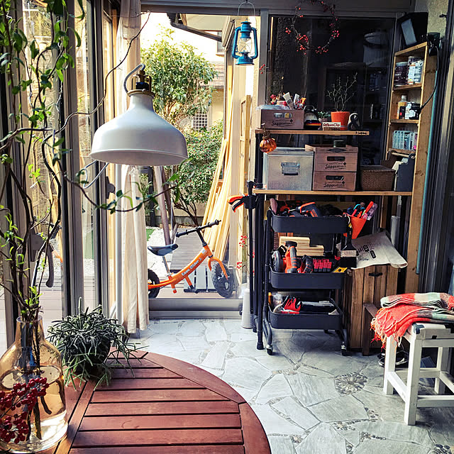 自然いっぱいのおうちでDIYを楽しんでいるladybug.さんが数々のDIYアイテムを収納しているのは、サンルーム。リビングからは見えない位置に収納することで出しっぱなしでもOK、「思い立ったときにゴソゴソやるのが楽しみです」とのこと。「次は何をしよう?」という日々の楽しみが詰まった、ワクワクする空間ですね♪