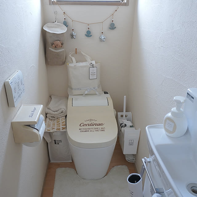 KNさんはおうちを建ててから10年経ったのを機に、トイレをプチリメイクしました。トイレのフタが変色していたため、ミルクペイントで白く塗り直し、CAINZのステンシルで英字のロゴをプリントしています。トイレのフタもステンシルで大きく生まれ変わり、まるで新築したようになりました!