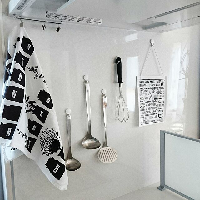 IHコンロ横の壁に掛けられたキッチンクロス。ハーブ×ポットの柄が印象的なキッチンクロスは、モノトーンなので、キッチンツールとも違和感なく調和しています。北欧を感じさせてくれるデザインが、清潔感あふれるキッチンにぴったりです☆