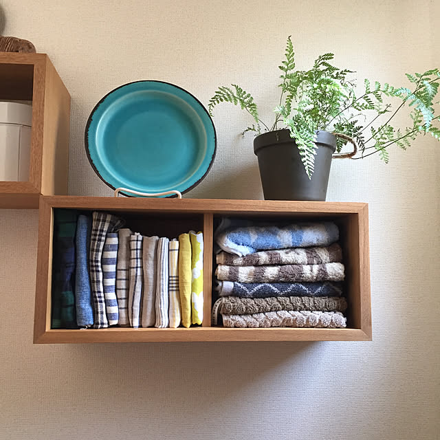 きちんとたたんで、棚に収納されたキッチンクロス。ユーザーさんは、リネンのクロスを愛用されていて、「棚に収まるだけ!と決めて増えすぎないようにしています」とのこと。コレクションとして眺めてもすてきな、キッチンクロスの収納法、お手本にしたいです♪