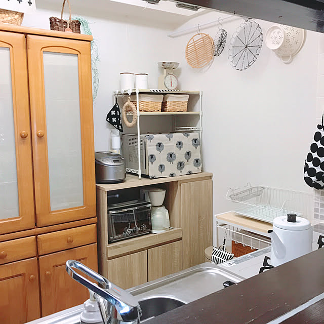 鍋やポットなどのキッチンツール柄が、キュートなキッチンクロス。スチールラック下段の目かくしとして、活用されている実例です。ベージュ×ブラックの落ち着いたカラーのクロスなので、ナチュラルにすっきりなじんでいますね☆