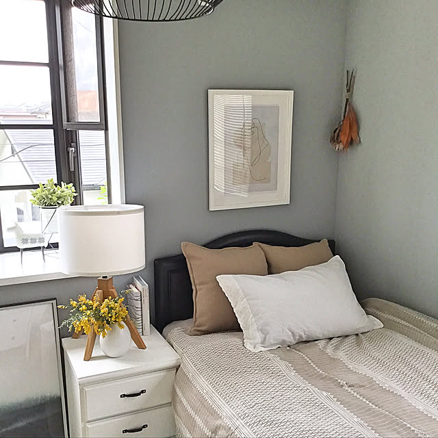 クロスにグレーを取り入れて、海外風のモノトーンコーディネートに仕上げていたkuruさん。ハンサムなモノトーンには、アースカラーのベッドメイクで品のある優しい空気をまとわせていました。ベージュやブラウンが、グレーにぬくもりを与えてくれるので、リラックスできる空間作りに取り入れたいですね。
