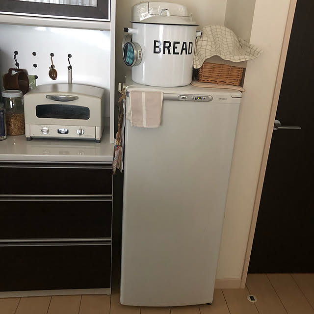こちらの存在感たっぷりの蓋つきブレッド缶を使っているのは、moonさん。冷凍庫の上に置いて、中にはお米を保存しているそうです。清潔感あふれるホワイトカラーのため、大きいサイズですが重たい印象はありません。冷凍庫とカラーをそろえることも、すっきりとさせるコツですね♪