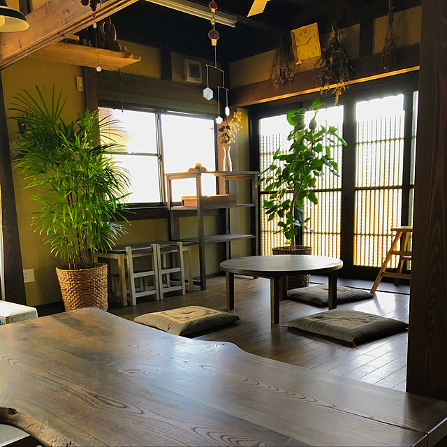 シンプルで落ち着いた空間に、日本ならではのちゃぶ台と座布団のスタイルがマッチした、mokushouさんのリビング。古民家カフェのようなおしゃれさと居心地の良さが調和した空間づくりです。観葉植物やドライフラワーが、レトロな空間に華を添えています。窓の縦格子も趣がありますね。