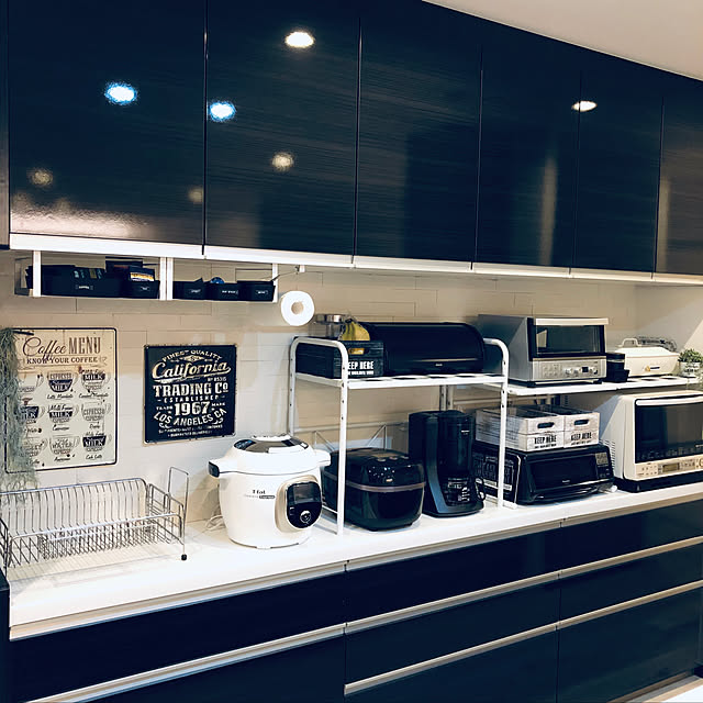 こちらのユーザーさんのカップボードは、パナソニックのラクシーナだそうです。モノトーンでまとめられていて、かっこいい雰囲気になっていますね。収納も工夫されていて、とても使いやすそうです。