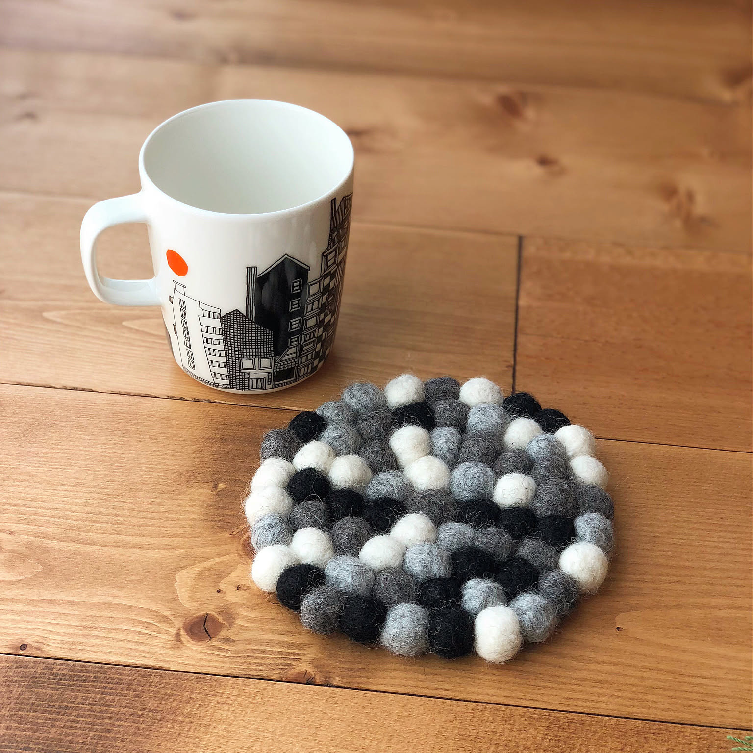 フェルトボールの応用で鍋敷きを作ることができます。ユーザーさんのすばらしいアイディアです。フェルトボールを円形状につなげることでかんたんに完成します。サイズもボールの大きさや数で変えられるのでコースターなども作れそうですね。