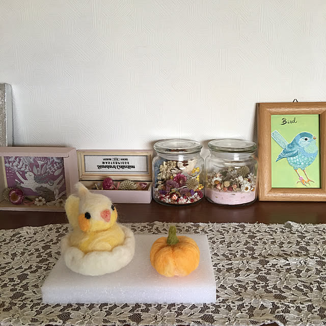 こちらのフェルト作品はユーザーさんが謎の鳥という命名をしています。茶目っ気がっていいですね。卵のからもフェルトでつくってあります。ふわっとした鳥の質感がGOODです。材料が余っても余った分だけでいろいろ作れるのが羊毛フェルトのメリットです。