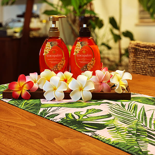ダイソーの手ぬぐいを、テーブルランナーのようにして使っているユーザーさん。プルメリアの小物雑貨と、トロピカル風な植物の模様がマッチしていて、南国にいるような気分になりますね♪奥にはアジアンテイストな家具や観葉植物もあるという、ユーザーさんのこだわりが感じられるお部屋です。
