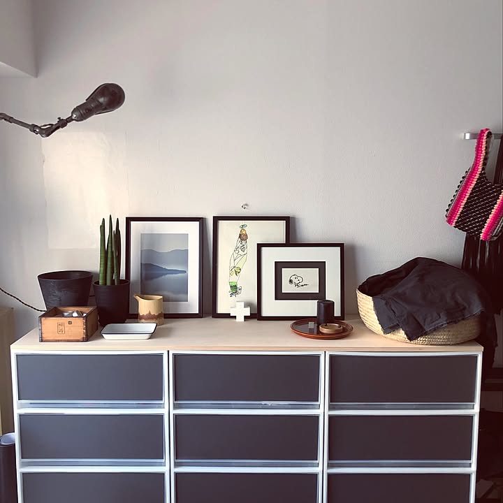 まず意識しているひとつ目は、収納家具などを持ちすぎないこと。収納家具って、しまえてもその家具自体はどこに置くの?という悪循環に陥りやすい気がするんです。だから本当に必要なサイズや収納量を吟味するようにしています。ふたつ目は、必ずきれいにしておく場所をいくつか決めておくことです(ダイニングテーブルの上など)。そうすると、なぜか必要なものは必要な場所へ収まり、いらないものが増えない気がします。こだわりと言えるかわかりませんが、見えていて心地よいものは飾って収納しますし、出ていて困るものは極力持たない努力をしています。」