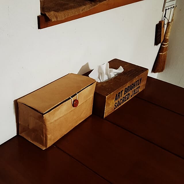 こちらの中身はマスクが入っているようです。紙袋をマスクの箱に合わせて切り、ボタンを縫い付けています。さっと取り出せるうえにインテリアにも馴染む、ナイスなアイディアです。お部屋のテイストに合わせて、紙袋の色柄を選ぶのも楽しいですね☆