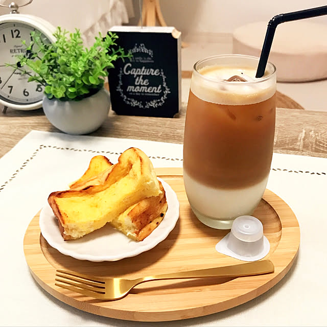 momomoさんの、くつろぎのカフェタイムの様子です。プレート以外は、すべてダイソーのアイテムでコーディネート。アイスカフェラテがひときわ美味しそうです♡さりげなく日々に溶け込む食器たち、絵になりますね。