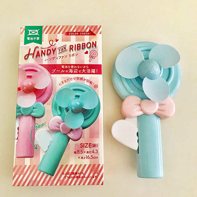 こちらは、ほんのりパステルカラーとリボンがかわいいセリアのハンディファン。なんと驚くことに電池不要なんです。取手部分のレバーを握ると羽根が回る仕組み。電池不要なので、水がかかっても安心なため、海やプール、夏のレジャーにもってこいですね。