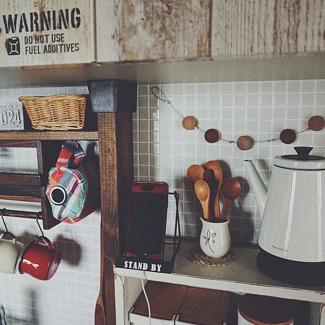 カフェのような素敵なキッチンの片隅に置いてあるスマホスタンド。こちらは、セリアのアイテムを組み合わせた簡単DIYのスマホスタンドです!組み合わせ方にユーザーさんのセンスの良さを感じます。レシピスタンドとしても大活躍ですね!