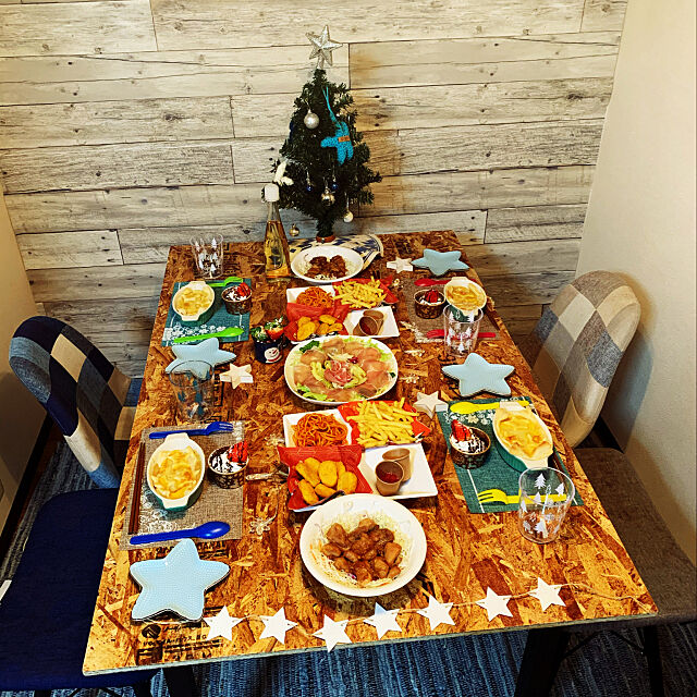 カリフォルニアスタイルがお好きなseaさん。星型のお皿やガーランド、ツリーがプリントされたコップといったように、クリスマスの食卓にもお気に入りのインテリアをうまくミックスされています。爽やかな色づかいと豪華な料理が見事に調和しています。