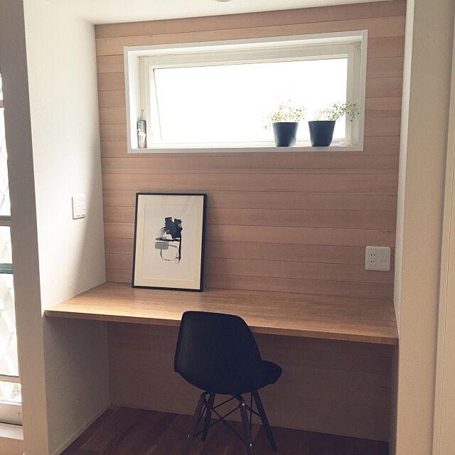 ダイニングの近くにあるというスタディスペース。ここは、無垢材をポイントにして造作された場所なんだそうです。椅子に座ると、視界が木だけの空間になり、心地よい香りも感じられるhome13.emiさんのお気に入りの場所です。ダイニングと空間が続いていても、個室感を味わえるスペースになっています。