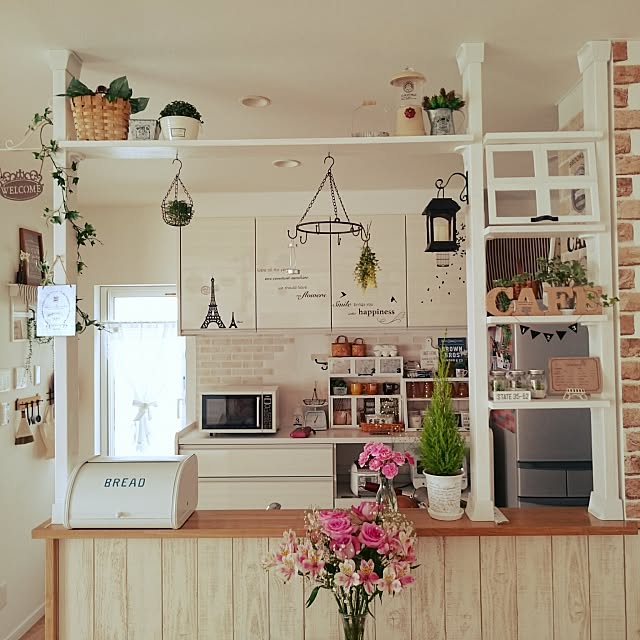 ナチュラルなカフェ風キッチンのユーザさん。キッチンカウンターに取り付けたディアウォールは、雑貨を飾るだけでなく窓をつけてよりカフェ風に仕上げています。吊戸棚収納には、パリ風シールを貼って細部までこだわっているインテリアです。