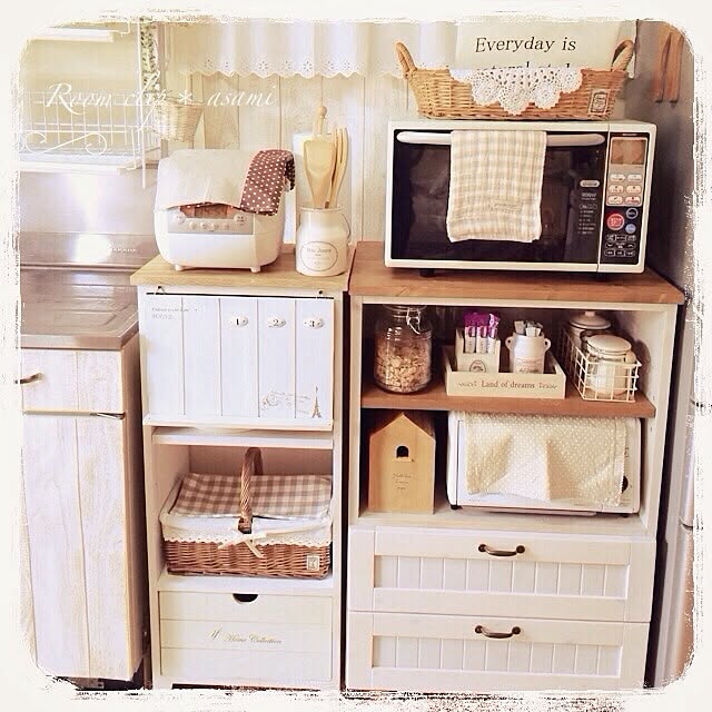 こちらのユーザーさんはキッチンの隣に棚を置いて、家電や食品を収納しています。木材の棚にホワイトの扉がついていて、家電にもカントリー風な布が掛けられているので、柔らかなナチュラルテイストの空間ができあがっています。ほっこりした雰囲気にあこがれます。