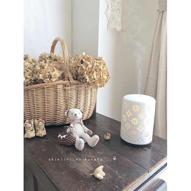 疲れたり、子育てでイライラしたらアロマでリラックスしているユーザーさんです。ニトリのアロマディフューザーを使っています。お花のデザインが可愛くてなんだかほっこり☆シンプルなデザインなので、ナチュラル感のあるインテリアともマッチしています。