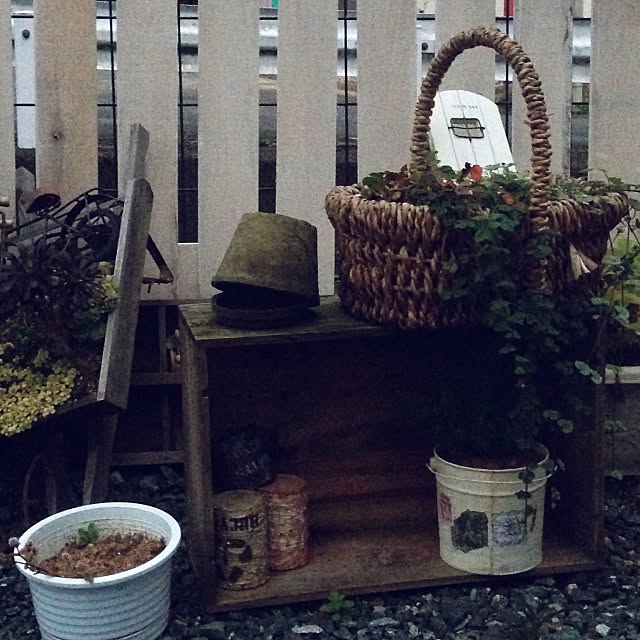 こちらはお店のガーデンのようなディスプレイでおしゃれな雰囲気に仕上げられています。木のカベの下にはりんご箱が設置されています。りんご箱に板カベをつけることで安定感も増します。用具を箱の中にいれることで雨風から守ることができるのでよいでしょう。
