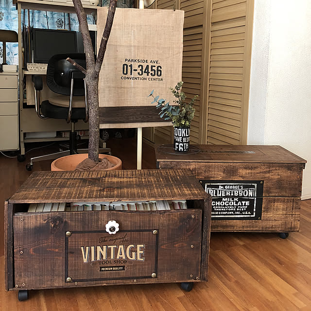 カッコいいデザインでデコレーションされているのがりんご箱をリメイクした収納ボックスです。収納ボックスリメイクの定番であるキャスターもしっかりついていて機動力はバツグンです。サイドテーブルの使用もできます。