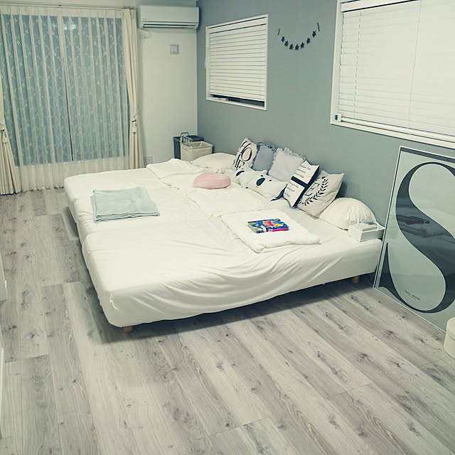 s-homeさんの寝室は、白×グレーを意識した空間になっています。ホワイトオークは白×グレーの景観の邪魔をしない淡いデザインなので、主張が強すぎず調和が取れた空間になっていますね。モノトーンでシンプルに仕上げるインテリアは、ゆっくりと落ち着いて過ごしたい寝室に最適です。
