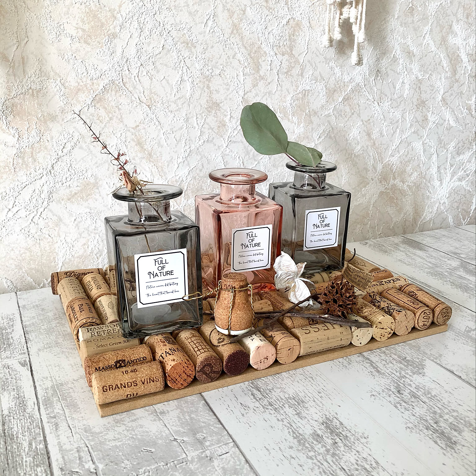 こちらの実例では「ガラスボトルキューブ」のうち、2色のガラス瓶が置かれています。色違いでそろえると、より変化が生まれるのがいいですね。コルクマットやさりげなく飾られた葉や実と、ボトルの趣きのあるスモーキーカラーがマッチしていて、洗練されたディスプレイとなっています。