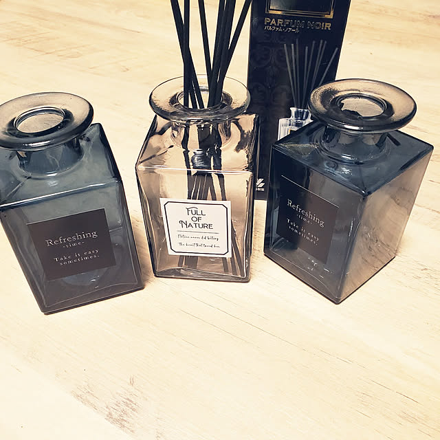 こちらのユーザーさんは、「ガラスボトルキューブ」に芳香剤をプラスされています。モノトーンカラーの瓶とブラックの芳香剤は見た目もぴったりで、エレガントな印象を受けるインテリア雑貨となっていますね。見た目も香りも楽しめるのが◎です。