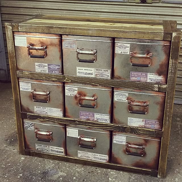 無印良品のトタンボックスにサビ加工用の塗料を塗って、木枠にはめ込んで作ったオリジナルの収納です。各ボックスに貼られたラベルシールも相まって、工場で長年使われていそうな雰囲気になっています。