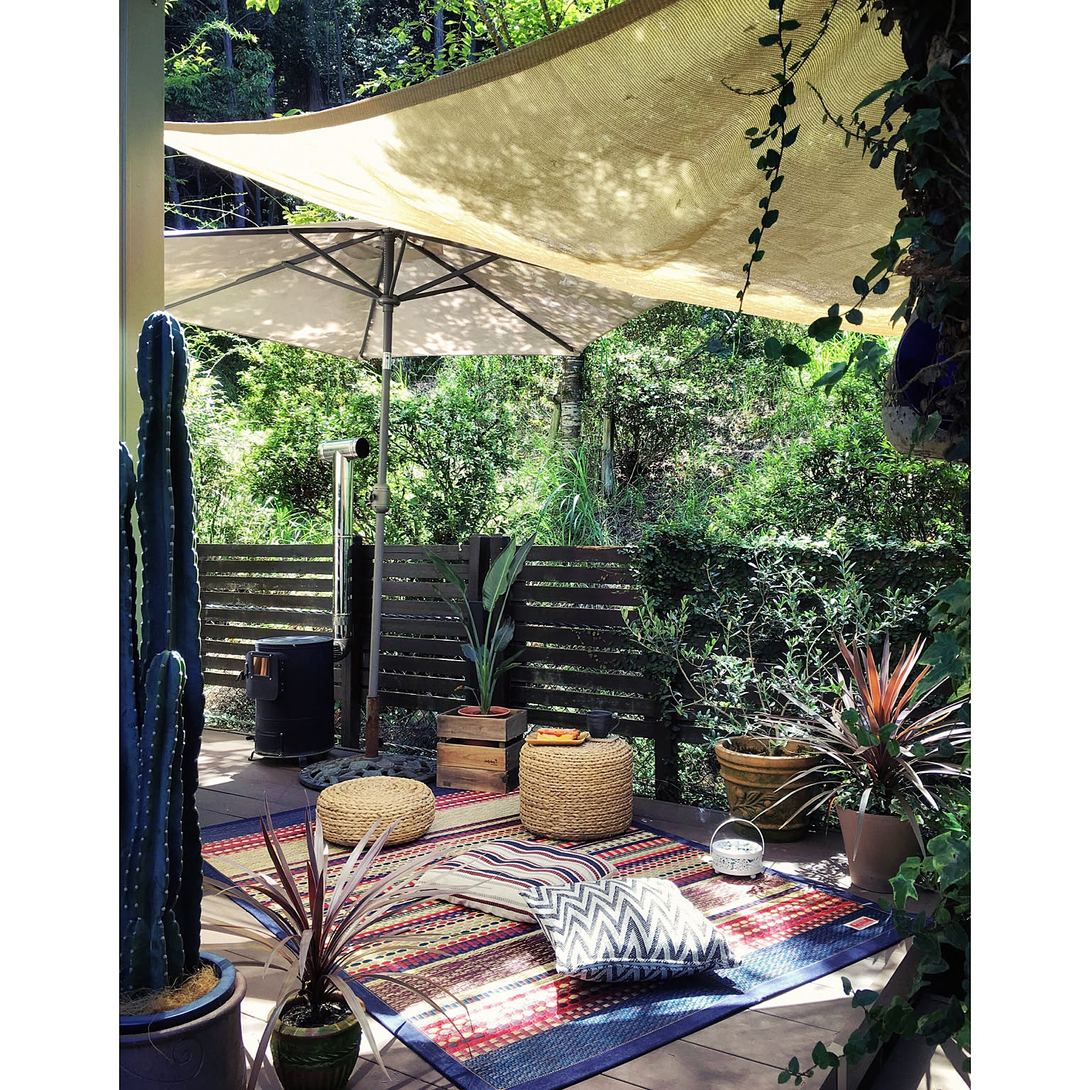 屋外のデッキに、い草ラグを敷いたladybug.さん。い草ラグの天然の質感や、インパクトのあるイケヒコのい草ラグの柄の効果も加わって、リゾート感が演出されています。植物との相性も抜群!屋外の開放感と、お部屋にいるようなくつろぎ感を同時に感じられる、夢のインテリアコーディネートです。
