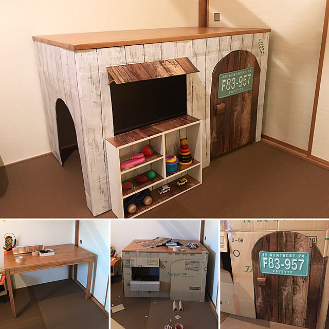 Teaさんはダイニングテーブルを活用して段ボールハウスを作りました。テーブルの下の部分をぐるりと段ボールで囲い、窓や扉を作れば完成です。窓の外に設置した棚はカウンターとして活用。丈夫なのでたくさん物を乗せられます。