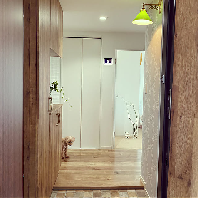 大阪府在住のakaiboushiさんご家族が暮らすのは、4LDKの2階建てマンションです。中古で購入し、セルフリノベーションで個性豊かに快適を追求されています。玄関へ入ると、アンティークのウォールランプの灯りでそっと照らされた、温かくエレガントな雰囲気で迎えてくれました。こちらの眺めひとつをとっても、タイルや壁紙を貼りかえ、棚にリメイクシートをあしらい……と時間を掛けてじっくりつくり込まれたそうです。
