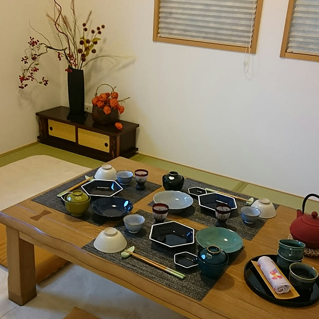 bebikoさんは、和室に似合うシックな色合いでコーディネートされました。ランチョンマットも食器も落ち着いた色味となっています。六角形の器がアクセントになり、空間を引き締めてくれています。右端にある急須も雰囲気をアップさせてくれますね。