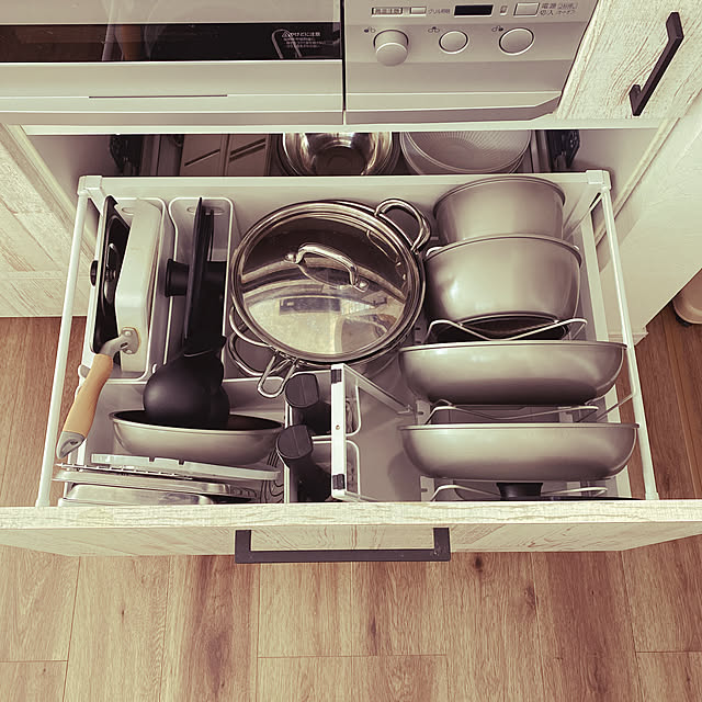 さまざまな収納アイテムを駆使して、美しく整えられたキッチンの引出し。RN...mさんはNブランのツールスタンドを2つ並べ、フライパンの取っ手を立てて収納されています。深さのある引出しでは置き場所に悩む取っ手も、これなら邪魔にならず、出し入れしやすそうです。