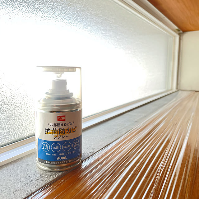 キッチンの上のほうの棚には、汚れ予防にラップを敷いているというjimisさん。さらに、窓の結露で窓枠がカビるのを防ぐために、抗菌防カビスプレーを取り入れています。3ヶ月ほど効果があるらしいので、手が届きにくいところなどにうれしいですね。