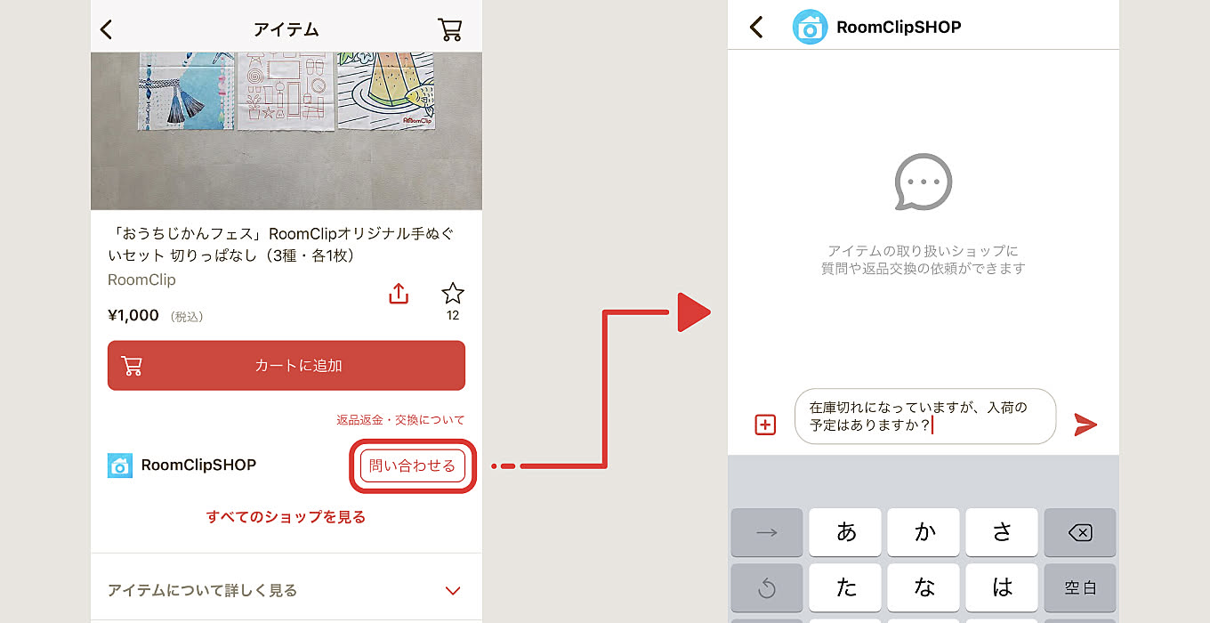 アイテム詳細画面のショップ名横にある「問い合わせる」から、ショップとのチャットを開始することができます。こちらから、次回の入荷情報などをお問い合わせいただくことで、在庫切れのアイテムの状況を確認することができます。他にもアイテムについて分からないことなどがあれば、お気軽にショップに聞いてみてくださいね。