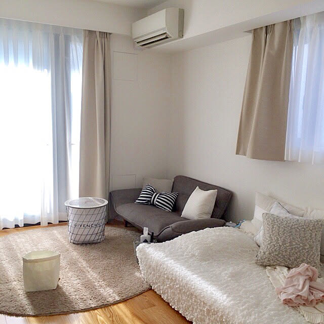 お部屋全体がホワイト系の色味で統一された、こちらの実例。膨張色とも言われるホワイトカラーなら、視覚的に部屋を広く見せることができます。淡い色味ならではの柔らかな雰囲気で、ゆったりとくつろげそうですね。