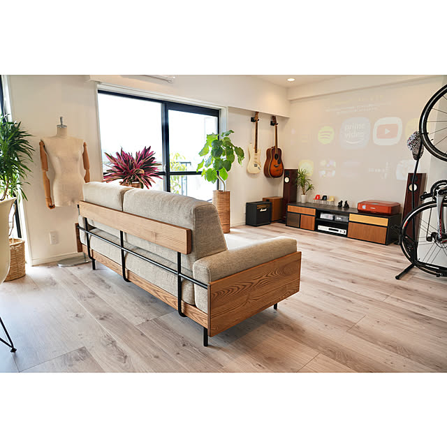 オーク材のヘリンボーンの床が印象的なsheさんのリビング。そのリビングに置かれているのが、北欧風の木製フレームが美しい、unicoの3シーターのソファです。シンプルなシルエットはインテリアともしっくり馴染み、洗練された印象の空間になっています。ゆったりとした座面は座り心地も良さそうですね。