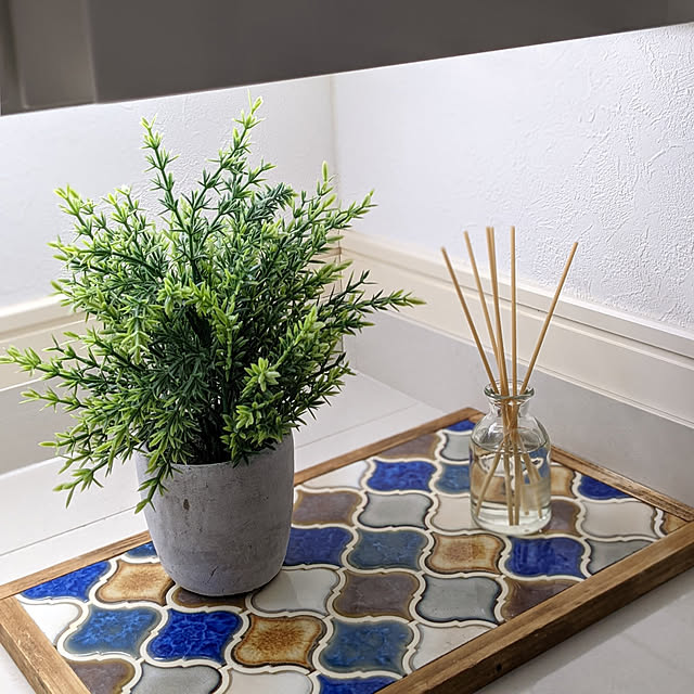 flannel.さんは、裏にシールがついていて目地もついている、便利なタイルを使ってトレーを作りました。落ち着いた色味のモロッカン柄が、よい雰囲気♪ 1ピースずつ独立しているので、好きな配色の並びが選べるのも楽しいですね。トレーには、ルームフレグランスやグリーンを乗せて使っていらっしゃいます。
