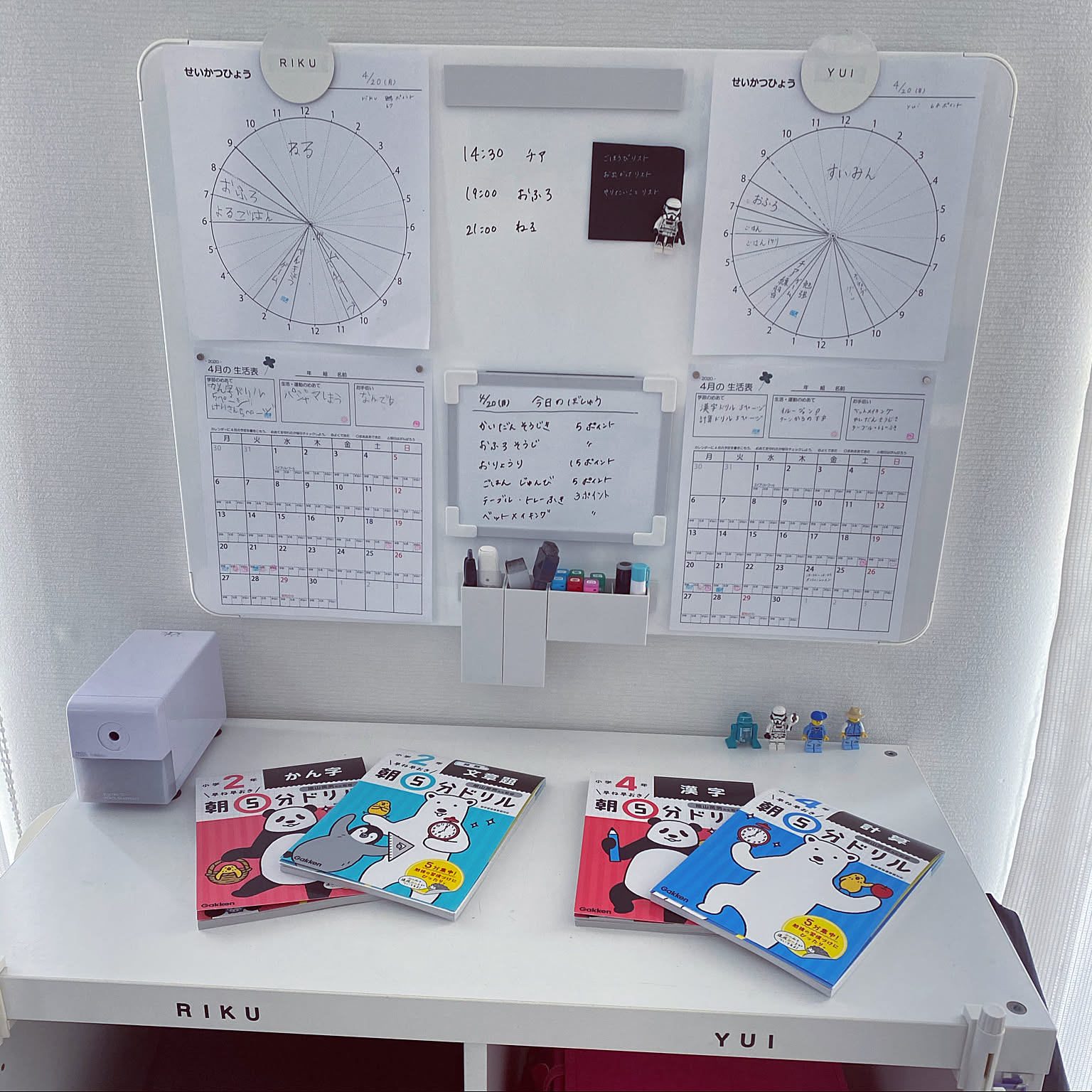 yanaさんは、ランドセルラックの上にホワイトボードを設置しています。ホワイトボードには予定表の他、文房具なども収納できるようになっているのでラック上は広々。教科書類の出し入れやドリルの内容確認などもスムーズにできそうです。
