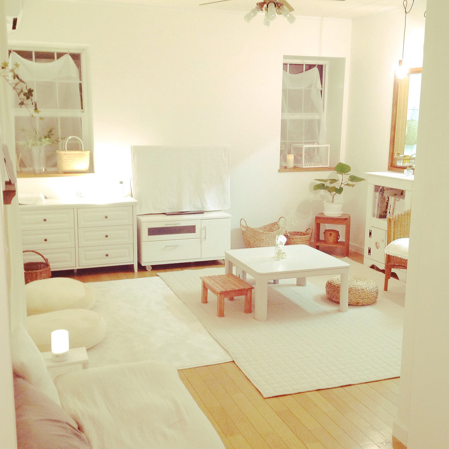 家具や壁面・ラグなどをホワイトで統一し、すっきりとした雰囲気のリビングに仕上げている実例です。テレビボードやテーブルは小さめに抑え、ソファの代わりにクッションをたくさん置くことで、省スペースを実現。心地よさそうな空間に、うっとりです。