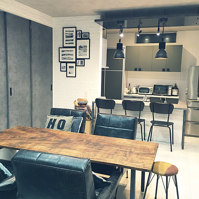 こちらは、モノトーンにモルタル調や木目を合わせた実例です。mameさんは、カウンターチェアやダイニングテーブルにアイアン素材を取り入れ、男前な印象に仕上げています。レザーやレンガタイルとの相性もバツグンですね。