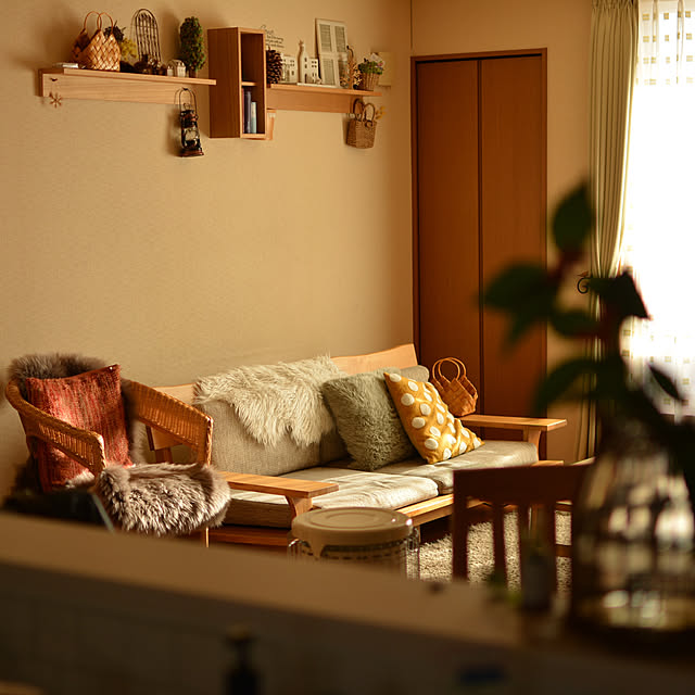 ナチュラルで温かみのあるインテリアは、mckさんのリビングです。キッチンから見える、リビングの壁面には、ナチュラルで可愛らしい雑貨をディスプレイしています。木のウォールシェルフが、お部屋や雑貨とマッチして優しい印象です。キッチンから見える癒しのスポットコーディネート、ぜひ真似してみてくださいね。
