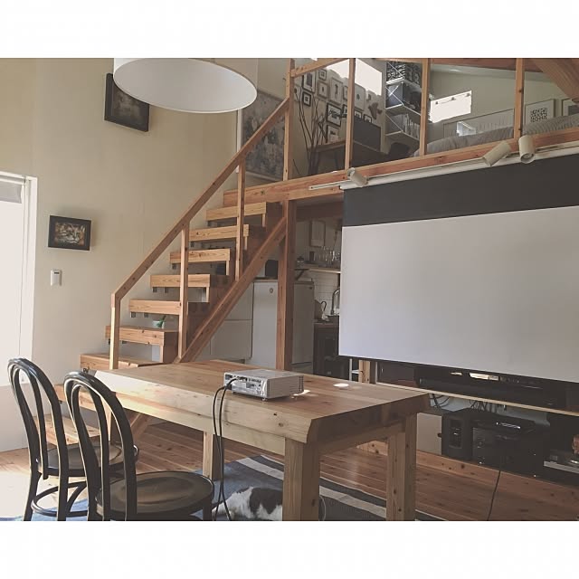 こちらは、狭小住宅にお住まいだというユーザーさん。ダイニングの正面にスクリーンを設置して、大画面を楽しめるようにしています。ミニマムな空間でも、心地よく映画を満喫できるようになっていて、憧れます♪