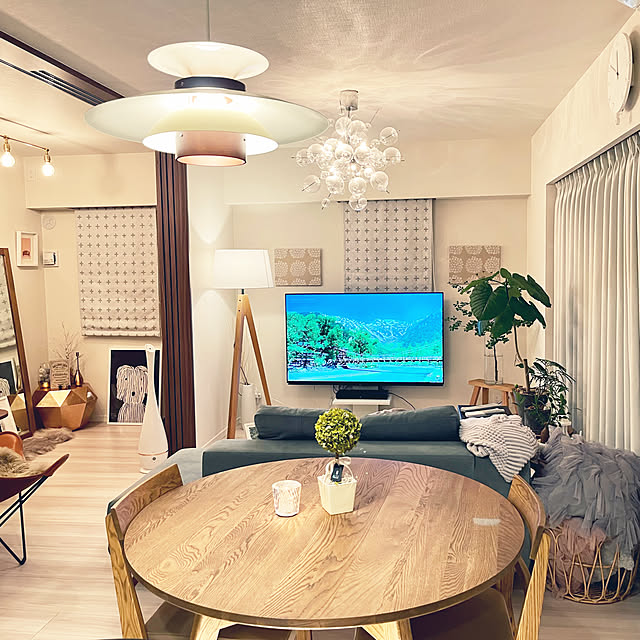 さまざまなアイテムを組み合わせて、自分らしい空間をコーディネートされているlavenderhillsさん。ダイニングは、ナチュラル感のある北欧インテリアです。照明、ファブリックパネルやカーテンの柄、雑貨や小物のチョイスもさすがです。